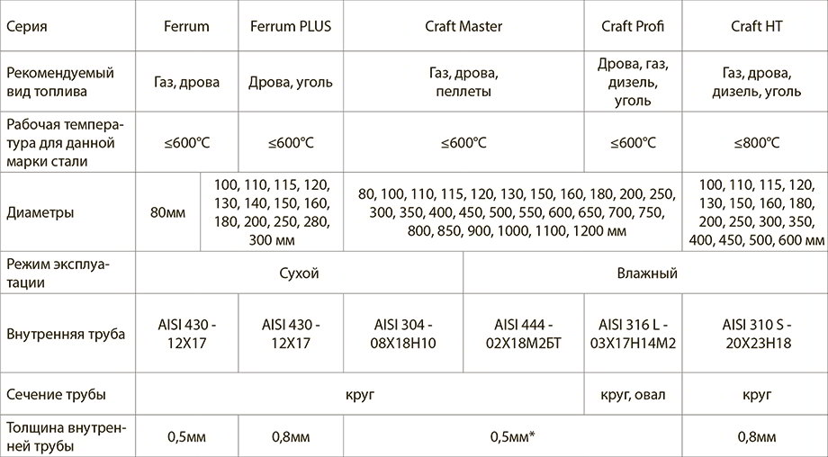 Элементы дымоходов Ferrum выпускаются в диапазоне диаметров от 80 до 300мм, Craft до 1200мм. Диаметр дымового канала должен быть равным либо больше диаметра дымоотводящего патрубка отопительного прибора (НПБ 252-98). Для несертифицированного прибора сечение дымового канала должно быть определено согласно ГОСТ 9817-95. При этом расчетная величина скорости топочных газов в канале должна находится в интервале от 0,15 до 0,60 м/с. (НПБ 252-98).